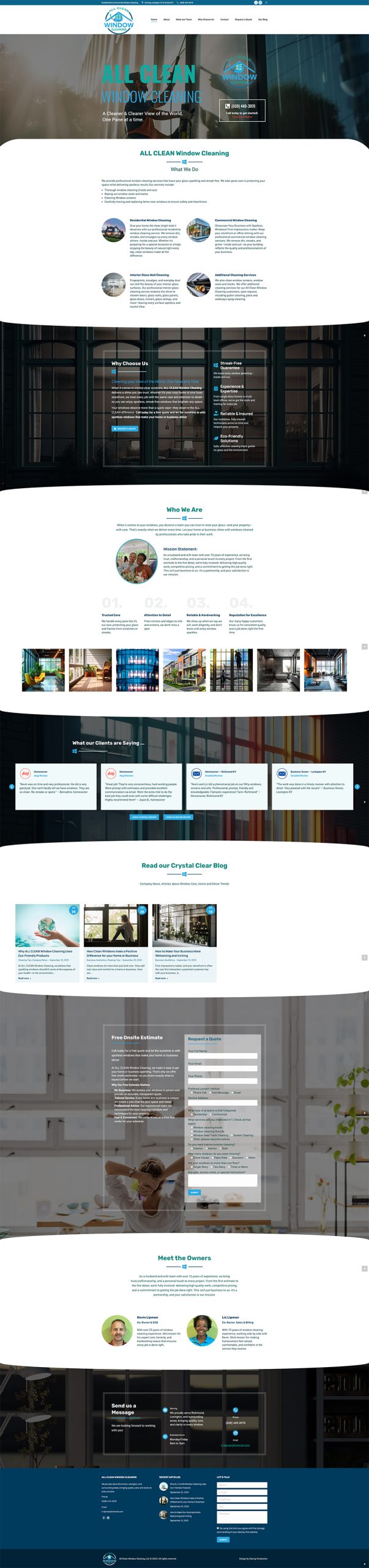 Liz and Kevin, married couple and partners in their window cleaning business, contacted Startup Production to reboot their web presence. A few years ago, their old site had gone down and they had lost access to all its content. In regards to their earlier branding attempts, they had sent an old graphic with their original logo on it, but because of the dark patterned background and resolution size, we had to recreate it, revise and clean it up for a more professional appearance and impression. After the new logo and branding was approved, we then began to work on their one-page website (which turned into four page with blog, quote form, privacy policy and blog). We created a visually appealing website with the essential content of Who We Are, What We Do, Where We Serve and Why Choose Us. We handled the challenge of comprising all of this keyword-rich content on one page without looking clutter, making it easy to read and offering easy navigation with on page links so users can quickly get to the information they are looking for.