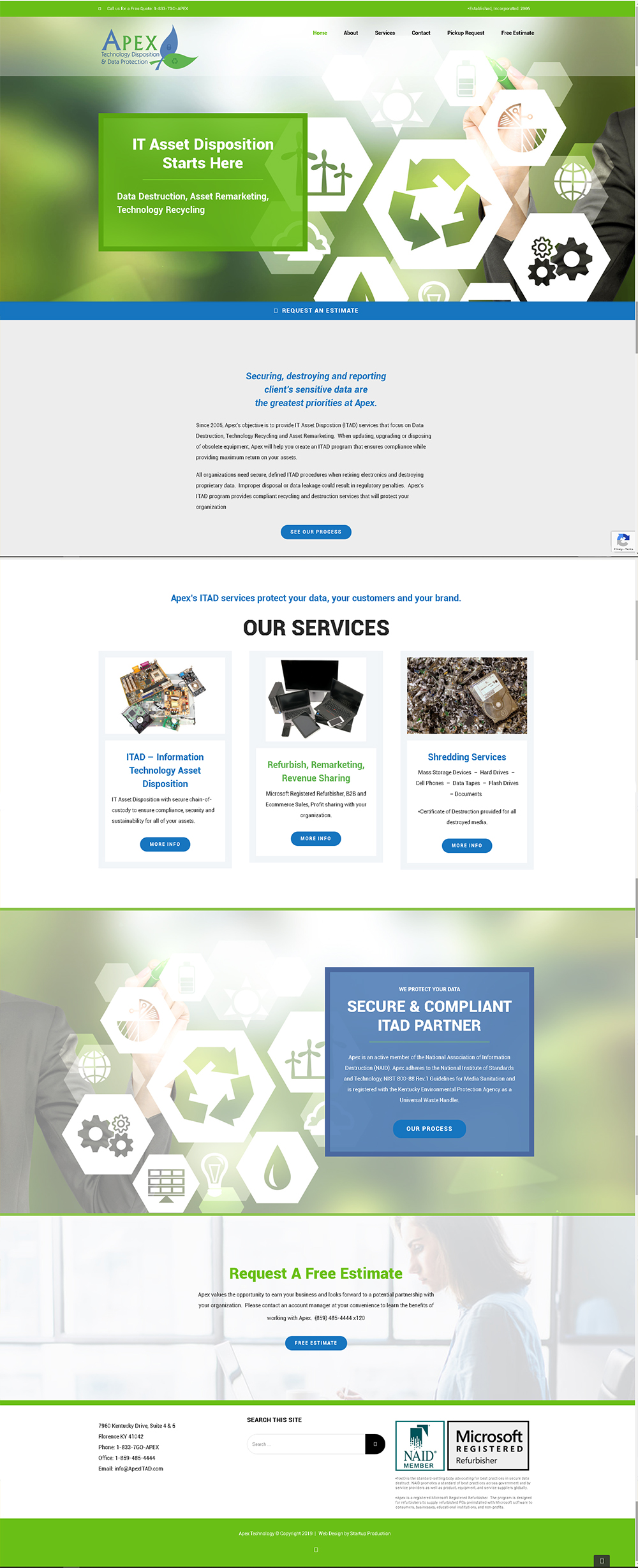 After more than ten years, this small business was in desperate need of a website redesign, as their services has changed, their branding and the processes they use had all been updated. The green elements throughout emphasize the focus on environmentally-friendly recycling, and the blue areas emphasized safe and secure data destruction. We worked closely with the clients on the website content, web design and layout of their new website design.