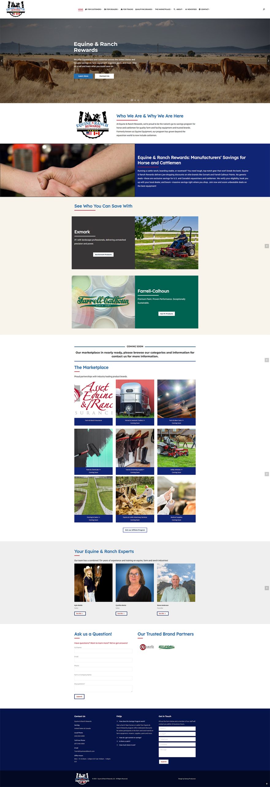 When Steve began building his third website for his newest venture, “Equine and Ranch Rewards”, he again contacted Startup Production to develop his new site with their new designed logo and their new target audience. The new website was developed and designed with their existing market of the equine industry but now also including the cattlemen, ranchers, race track owners, facility managers and cattle farmers. With a very dynamic business, changes are made often with new brands, their new marketplace which will build on their library of advertising partners, and their brand offerings in each category. We ensure the site is easy to navigate so the two audiences, the customers looking for savings and the dealers who want to facilitate the savings, would find what they needed with pages directly talking and informing them. The site colors and branding had changed a few times during construction, so changes were made to support those mid-project developments. The content was entirely revised by the staff and is continually being updated as business decisions are made and new brand partners are brought on board.