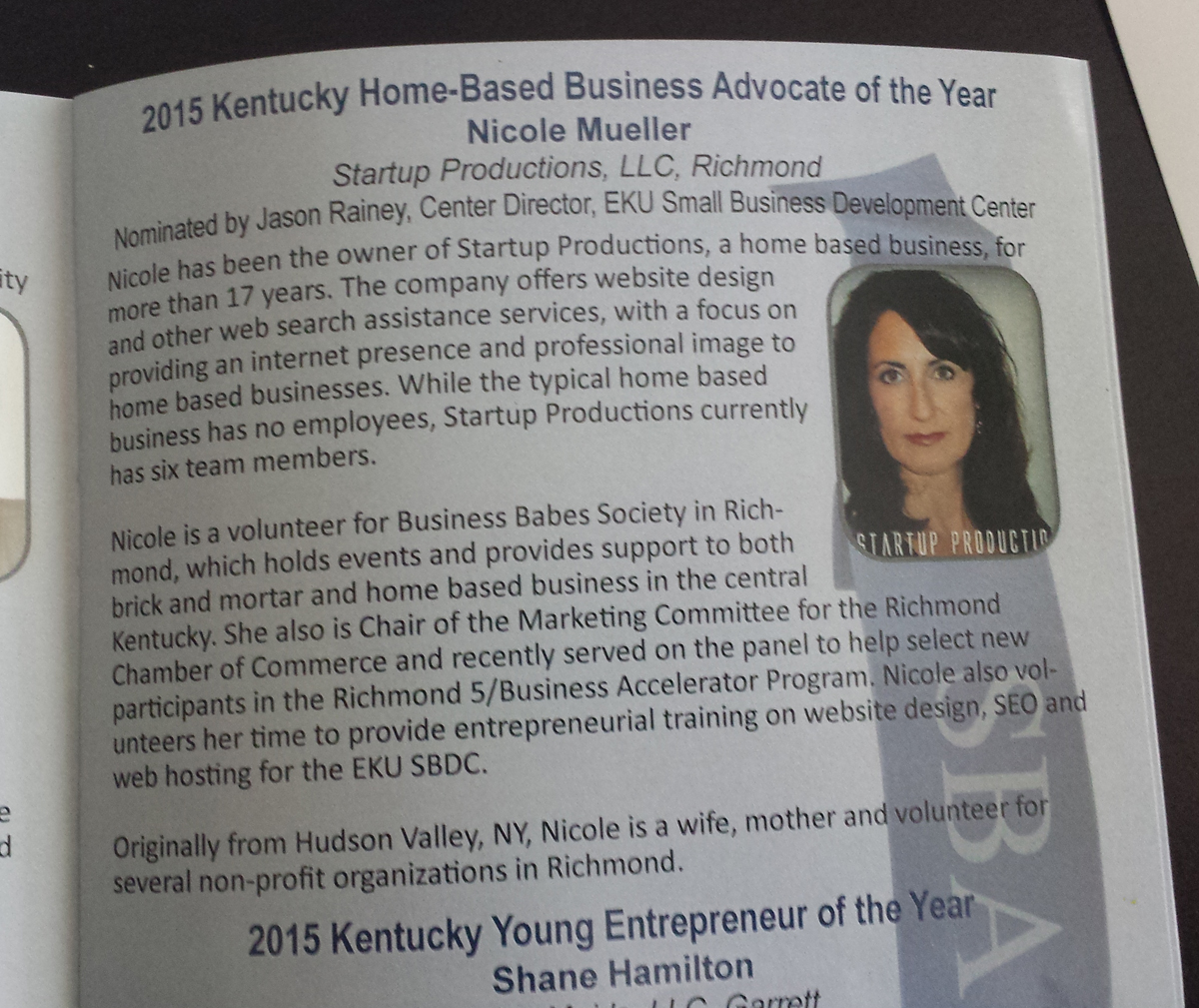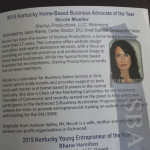 Nicole was awarded the 2015 Home-Based Small Business Advocate of the Year award. The 2015 Kentucky Small Business Administration award winners are: